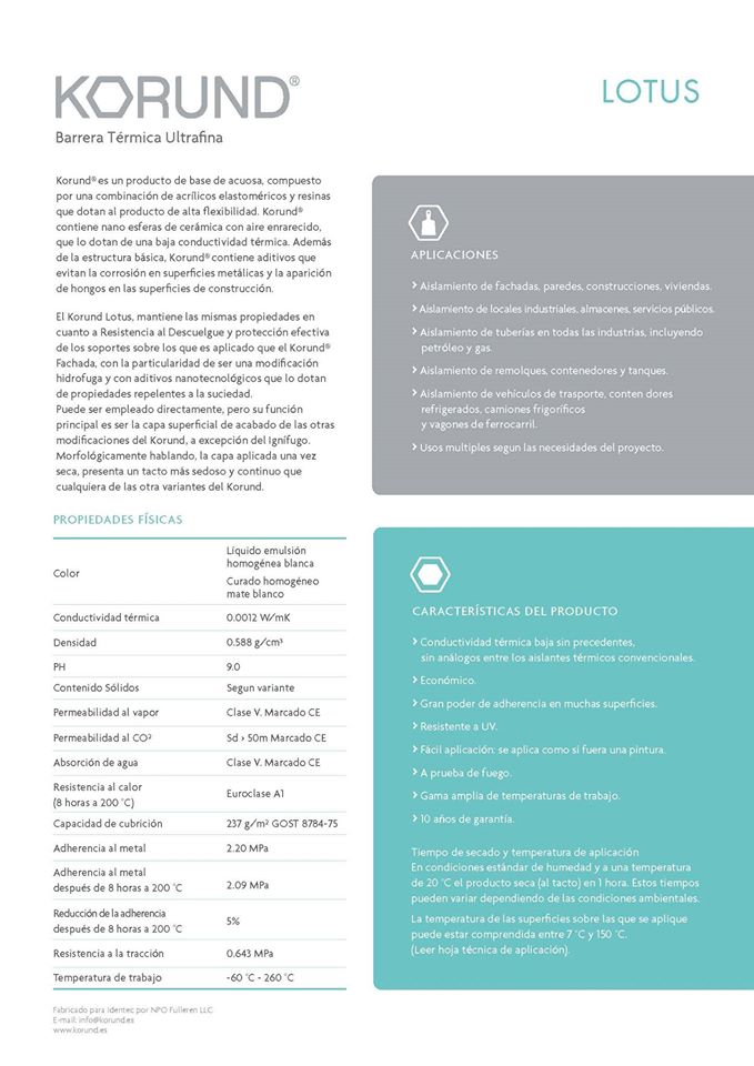 El Korund Lotus, mantiene las mismas propiedades en cuanto resistencia al descuelgue y protección efectiva de los soportes sobre lo que es aplicado que el Korund Fachada, con la particularidad de ser una modificación hidrofuga y con aditivos nanotecnológicos que lo dotan de propiedades repelentes a la suciedad.